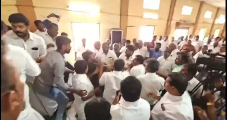 சில நிர்வாகிகள் நாற்காலிகளை தூக்கி அவரை தாக்கினர். இதனால் கூட்டத்தில் பதற்றம் ஏற்பட்டது. சில நிர்வாகிகள் பிரவினை மீட்டு அங்கிருந்து பாதுகாப்பாக வெளியேற்றினர்.