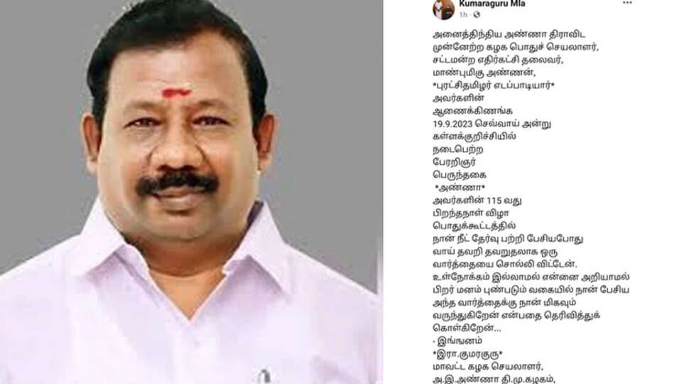 இந்நிலையில் எம்.எல்.ஏ குமரகுரு தனது முகநூல் பக்கத்தில், “அனைத்திந்திய அண்ணா திராவிட முன்னேற்ற கழக பொதுச் செயலாளர், சட்டமன்ற எதிர்கட்சி தலைவர், மாண்புமிகு அண்ணன்,*புரட்சிதமிழர் எடப்பாடியார்* அவர்களின் ஆணைக்கிணங்க 19.9.2023 செவ்வாய் அன்று கள்ளக்குறிச்சியில் நடைபெற்ற பேரறிஞர் பெருந்தகை *அண்ணா* அவர்களின் 115வது பிறந்தநாள் விழா பொதுக்கூட்டத்தில் நான் நீட் தேர்வு பற்றி பேசியபோது வாய் தவறி தவறுதலாக ஒரு வார்த்தையை சொல்லி விட்டேன். உள்நோக்கம் இல்லாமல் என்னை அறியாமல் பிறர் மனம் புண்படும் வகையில் நான் பேசிய அந்த வார்த்தைக்கு நான் மிகவும் வருந்துகிறேன் என்பதை தெரிவித்துக் கொள்கிறேன்” எனக் குறிப்பிட்டுள்ளார்.