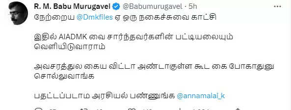 அதே மாதிரி அதிமுகவின் செய்தி தொடர்பாளர் பாபு முருகவேல் , அண்ணாமலையை கடுமையாக விளாசி இருக்கிறார்.