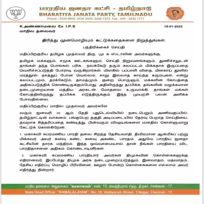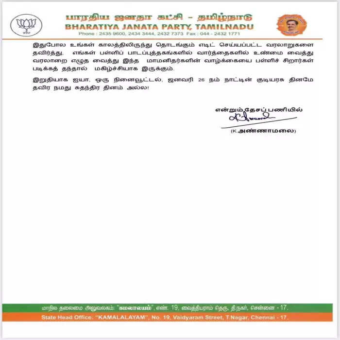 இதுபோல உங்கள் காலத்திலிருந்து எடிட் செய்யப்பட்ட வரலாறுகளை தவிர்த்து எங்கள் பள்ளி பாடப்புத்தகங்களில் வார்த்தைகளில் உண்மை வைத்து வரலாறை எழுதவைத்து இந்த மாமனிதர்களின் வாழ்க்கையை பள்ளிச் சிறார்கள் படிக்க தந்தால் மகிழ்ச்சியாக இருக்கும்” என எழுதியுள்ளார். முதலமைச்சர் ஸ்டாலின் முன்பொருமுறை மேடைப் பேச்சின்போது ஜனவரி 26ஆம் தேதியை வாய் தவறி சுதந்திர தினம் என்று பேசியிருந்தார். அதையும் சுட்டிக்காட்டியுள்ள அண்ணாமலை, "இறுதியாக ஐயா, ஒரு நினைவூட்டல், ஜனவரி 26 நம் நாட்டின் குடியரசு தினமே தவிர நமது சுதந்திர தினம் அல்ல” என நக்கல் செய்துள்ளார்.