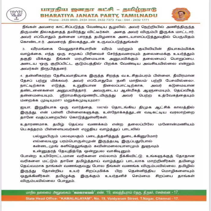 மகாகவி பாரதியார் தலைசிறந்த தேசியவாதி. தீவிர ஆன்மீகப்பற்று கொண்டவர். அவர் கண்ட கனவு அகண்ட பாரதம். அதுவே பாஜகவின் தாரக மந்திரம். திமுக கொள்கைகளுக்கு எதிரானவர். வ.உ.சியும் தேசப்பற்று மிக்கவர். 1967ஆம் ஆண்டிலிருந்து திமுக ஆட்சி காலத்தில், உள்நோக்கத்துடன் வடிகட்டிய வரலாற்றைதானே எம் மாணவர்களுக்கு வகுப்பறையில் கொடுத்துள்ளீர்கள். உதாரணமாக தமிழ்த்தாய் வாழ்த்தில் உயிரோட்டமான வரிகளை நீக்கினீர்கள்.