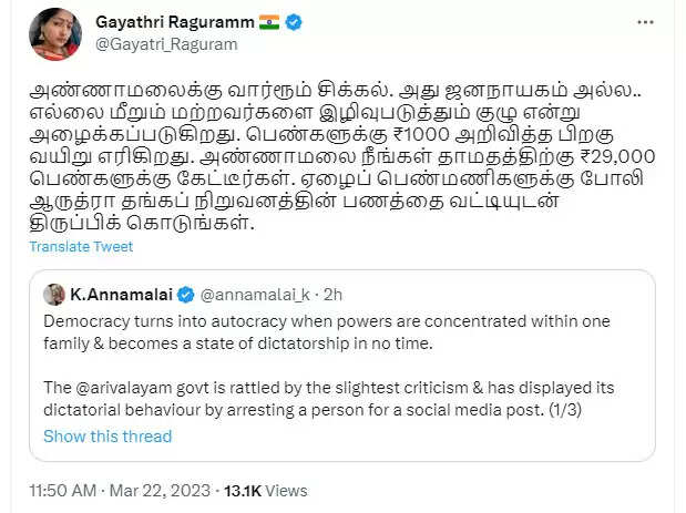 இதற்கு நடிகை காயத்ரி ரகுராம், ‘’அண்ணாமலைக்கு வார்ரூம் சிக்கல். அது ஜனநாயகம் அல்ல.. எல்லை மீறும் மற்றவர்களை இழிவுபடுத்தும் குழு என்று அழைக்கப்படுகிறது. பெண்களுக்கு ₹1000 அறிவித்த பிறகு வயிறு எரிகிறது. அண்ணாமலை நீங்கள் தாமதத்திற்கு ₹29,000 பெண்களுக்கு கேட்டீர்கள். ஏழைப் பெண்மணிகளுக்கு போலி ஆருத்ரா தங்கப் நிறுவனத்தின் பணத்தை வட்டியுடன் திருப்பிக் கொடுங்கள்’’ என்கிறார்.
