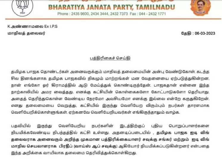 எனது தலைமையை வெறுத்து கட்சியிலிருந்து வெளியேற விரும்பும் நபர்கள் தாராளமாக வெளியேறி கொள்ளுங்கள். ஏற்கனவே வெளியேறியவர்கள் எங்கிருந்தாலும் வாழ்க . பதவியில் இருந்து வெளியேறிய நபர்களின் இடத்திற்கு புதிய பொறுப்பாளர்களை நியமிக்க வேண்டிய நிர்பந்தத்தில் கட்சி உள்ளது. அதன் அடிப்படையில் தமிழக பாஜக ஐடி வின் தலைவராக அனைவரும் அறிந்த முகமான பத்திரிக்கையாளர் சவுக்கு சங்கர் மற்றும் ஐடி வின் மாநில செயலாளராக பிரதீப் (வாய்ஸ் ஆப் சவுக்கு )ஆகியோர் நியமிக்கப்படுகின்றனர் என்பதை இந்த அறிக்கை வாயிலாக தலைமை தெரிவித்துக் கொள்கிறது என்று கூறப்பட்டுள்ளது . ஆனால் இந்த அறிக்கை போலியானது திட்டமிட்டு சில விஷமிகள் பரப்பி வருகின்றனர் என்று பாஜகவினர் கொந்தளித்துள்ளனர்.