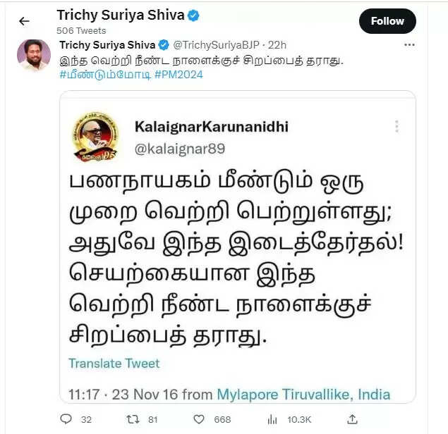 இந்த நிலையில் மறைந்த முன்னாள் முதல்வரும் திமுக தலைவருமான கலைஞர் கருணாநிதி 2016 ஆம் ஆண்டில் நடந்த இடைத்தேர்தலில் அதிமுக வெற்றி பெற்றதற்காக , ’’பணநாயகம் மீண்டும் ஒருமுறை வெற்றி பெற்றுள்ளது. அதுவே இந்த இடைத்தேர்தல். செயற்கையான இந்த வெற்றி நீண்ட நாளைக்கு சிறப்பை தராது ’’என்று ட்விட்டர் பக்கத்தில் அவர் பதிவிட்டிருந்ததை திமுகவிலிருந்து வெளியேறி பாஜகவில் இணைந்த திருச்சி சூர்யா சிவா அந்த ட்விட்டை தனது டுவிட்டர் பக்கத்தில் பகிர்ந்து இருக்கிறார். இந்த டுவிட்டர் பதிவு வைரல் ஆகி வருகிறது.
