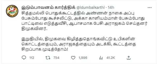 காளியம்மாளை ஆவேசமாக திட்டிக்கொண்டு செருப்பை கையில் எடுத்துக்கொண்டு மேடையை நோக்கி திமுகவினர் பாய்ந்து வந்ததால் பதிலுக்கு நாம் தமிழர் கட்சியினரும் ஆவேசமாக பாய்ந்தார்கள். அப்போது மேடையில் இருந்த நாம் கட்சி நிர்வாகிகள் வேண்டாம் வந்து விடுங்கள் போலீஸ் பார்த்துக்கொள்வார்கள் என்று சொல்ல நாம் தமிழர் கட்சியினர் திரும்பி விட்டனர். ஆனால் கடைசி வரைக்கும் திமுகவினர் சத்தம் போட்டு ரகலில் ஈடுபட்டுக் கொண்டிருந்தனர். இது தொடர்பான வீடியோ வலைத்தளங்களில் வைரல் ஆகி வருகிறது.