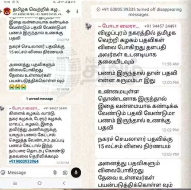 விழுப்புரம் நகரத் தலைவர் பதவிக்கு ரூ.15 லட்சம் நிர்ணயம் என அம்மாவட்ட் தவெக வாட்ஸ் அப் குரூப்பில் பதிவிடப்பட்டதாக வெளியான Chat ஆல் பரபரப்பு ஏற்பட்டுள்ளது. குறிப்பிட்ட் அந்த வாட்ஸ் அப் Chat-ல் புஸ்ஸி ஆனந்த் நம்பரும் உள்ளது. விழுப்புரம் பழைய பேருந்து நிலையம் அருகே பண பேரம் நடைபெற்றதாக அதர்ச்சி தகவலும் வெளியாகி பரபரப்பை ஏற்படுத்தியுள்ளது.