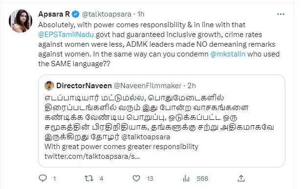 பதிலுக்கு அப்சரா, அதிகாரம் வரும்போது பொறுப்பும் அதற்கு ஏற்பவும் வருகிறது. அனைவரையும் உள்ளடக்கிய வளர்ச்சிக்கு எடப்பாடி பழனிச்சாமி அரசு உத்தரவாதம் அளித்துள்ளது. அதிமுகவில் ஆட்சியில் பெண்களுக்கு எதிரான குற்றங்கள் குறைவாக உள்ளன. அதிமுக தலைவர்கள் பெண்களுக்கு எதிராக எந்த விதமான தரக்குறைவான கருத்துக்களையும் தெரிவிக்கவில்லை. பேசியிருந்தால் கண்டிக்கலாம். எடப்பாடி பழனிச்சாமி பேசியதை மு.க.ஸ்டாலினும் பேசியிருக்கிறார் என்று குறிப்பிட்டிருக்கிறார்.
