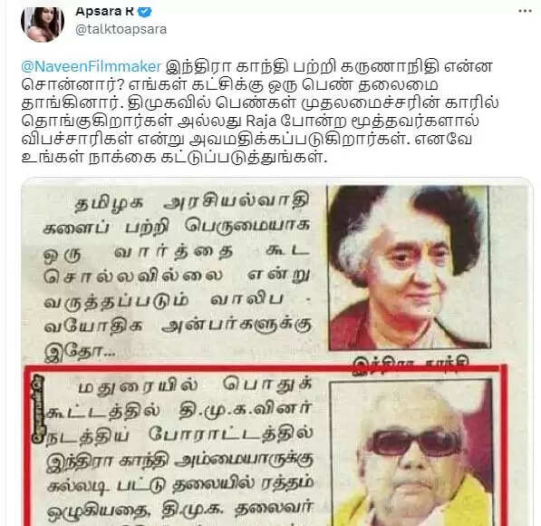 நவீனின் இந்த பதிவுக்கு பத்திரிகையாளரும், அரசியல் விமர்சகருமான அப்சரா கண்டனம் தெரிவித்திருக்கிறார். ’’இந்திரா காந்தி பற்றி கருணாநிதி என்ன சொன்னார்? எங்கள் கட்சிக்கு ஒரு பெண் தலைமை தாங்கினார். திமுகவில் பெண்கள் முதலமைச்சரின் காரில் தொங்குகிறார்கள் அல்லது Raja போன்ற மூத்தவர்களால் விபச்சாரிகள் என்று அவமதிக்கப்படுகிறார்கள். எனவே உங்கள் நாக்கை கட்டுப்படுத்துங்கள்’’ என்று பதிவிட்டுள்ள அப்சரா, ஒரு பேப்பர் கட்டிங்கையும் பகிர்ந்திருக்கிறார் .