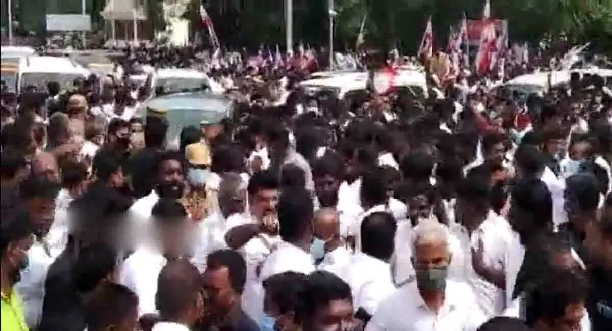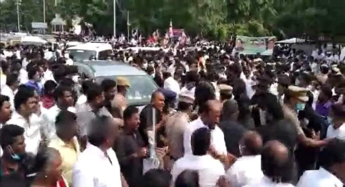 இருவருக்கும் ஒரே நேரத்தில் அஞ்சலி செலுத்த நேரம் ஒதுக்கியதால் இந்த சிக்கல் ஏற்பட்டது. எடப்பாடி பழனிச்சாமி, ஓ. பன்னீர்செல்வம் வாகனங்கள் செல்ல முற்பட்ட போது எதிரே அமமுகவினர் வந்ததால் காமராஜர் சாலையில் போக்குவரத்து முடங்கியது. இதனால் அங்கு பெரும் பரபரப்பு பதற்றம் ஏற்பட்டது.