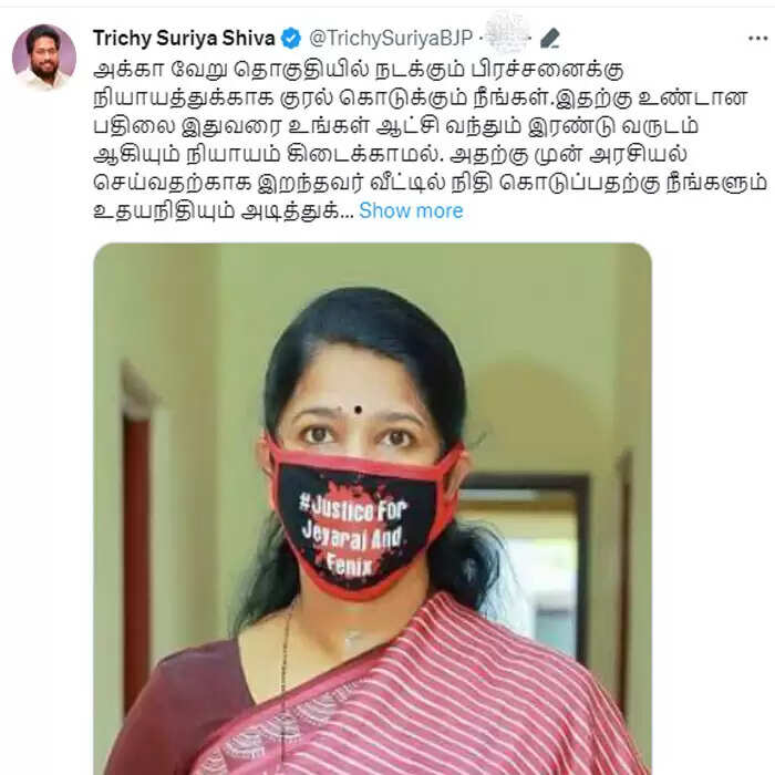 இந்நிலையில் இதுகுறித்து திருச்சி சூர்யா, கனிமொழி எம்பிக்கு கேள்வி எழுப்பி இருக்கிறார். ‘’அக்கா வேறு தொகுதியில் நடக்கும் பிரச்சனைக்கு நியாயத்துக்காக குரல் கொடுக்கும் நீங்கள். இதற்கு உண்டான பதிலை இதுவரை உங்கள் ஆட்சி வந்தும் இரண்டு வருடம் ஆகியும் நியாயம் கிடைக்காமல். அதற்கு முன் அரசியல் செய்வதற்காக இறந்தவர் வீட்டில் நிதி கொடுப்பதற்கு நீங்களும் உதயநிதியும் அடித்துக் கொண்டு போய் கொடுத்தீர்களே நிதி கொடுத்தீர்கள் நியாயம் கொடுத்தீர்களா?’’ என்று கேட்கிறார்.