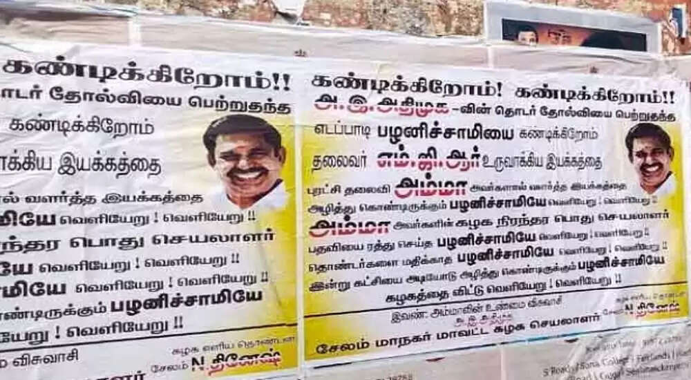 எடப்பாடி பழனிச்சாமியின் ஆதரவாளரும் சேலம் மாநகர் மாவட்ட அதிமுக செயலாளருமான தினேஷ் பெயரில் சேலம் மாநகரின் பல்வேறு இடங்களில் போஸ்டர்கள் ஒட்டப்பட்டுள்ளன .  அந்த போஸ்டரில் எடப்பாடி பழனிச்சாமிக்கு  கண்டனம் தெரிவிக்கப்பட்டு இருக்கிறது.