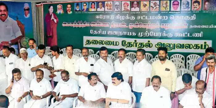 அதிமுக சார்பில் தென்னரசு போட்டியிடுகிறார். இதற்காக பெருந்துறை சாலையில் அரசு மருத்துவமனை ரவுண்டானா அருகே பணிமனை அமைக்கப்பட்டு இருக்கிறது . அந்த பணிமனையை அமைத்த போது அதிமுக தலைமையிலான கூட்டணி என்றும், திறப்பு விழா நடந்த போது தேசிய ஜனநாயக முற்போக்கு கூட்டணி என்றும் பேனர் வைத்தனர். அன்று மாலையே முற்போக்கு என்பதை தூக்கிவிட்டு தேசிய ஜனநாயக கூட்டணி என்று பெயரை மாற்றி பேனர் வைத்தனர் . மறுநாள் காலையில் அதையும் அகற்றி விட்டு அதிமுக கூட்டணி வேட்பாளர் என்று மாற்றினார்கள்.