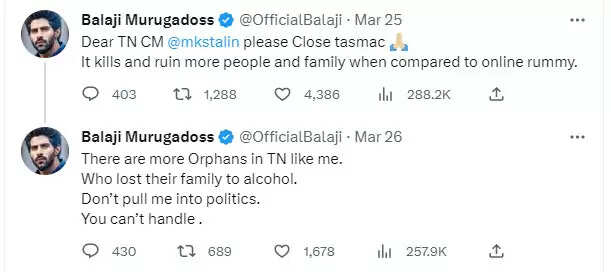 பிக்பாஸ் புகழ் பாலாஜி முருகதாஸ், தனது டுவிட்டர் பக்கத்தில் முதலமைச்சர் ஸ்டாலினை டேக் செய்து, தயவு செய்து டாஸ்மாக் கடைகளை மூடுங்கள். இது ஏராளமான உயிர்களை அழித்து உள்ளது. ரம்மியை ஒப்பிடும்போது குடியால் அழிந்தவர்கள் தான் அதிகம் என்று பதிவிட்டு இருந்தார். இவரது பதிவை பார்த்த திமுகவினர் கடும் எதிர்ப்பு தெரிவித்து கண்டனங்களை தெரிவித்து வந்தனர்.