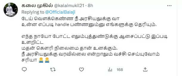 பாலாஜி முருகதாஸின் இந்த பதிவு பெரும் பரபரப்பை ஏற்படுத்தி இருந்த நிலையில், இதற்கு எதிராக கொதித்து எழுந்த திமுகவினர், ’’டேய் வெளக்கெண்ண நீ அரசியலுக்கு வா உன்ன எப்படி handle பண்ணனும்னு எங்களுக்கு தெரியும்.., ‘’எந்த நாயோ போட்ட எலும்புத்துண்டுக்கு ஆசைப்பட்டு இப்படி உளறிட்ட மதன் கௌரி நிலைமை தான் உனக்கும். நீ அரசியலுக்கு வரவில்லை என்றாலும் வச்சி செய்யுவோம் சரியா ?’’, ’’தம்பி.. பிக்பாஸில் பாஸாகியும் வியாபாரம் சூடு பிடிக்காத காரணத்தால் நீ விளம்பர வெளிச்சம் தேட சூரியனை பார்த்து குரைக்கும் நாய் போல குரைத்துக் கொண்டு இருக்கிறாய். திராவிட மங்கிகளின் கல் அடிகளால் நீ கதற போவது நிச்சயம். உனது குடும்பம் அனாதையாகி போகாமல் பத்திரமாக பார்த்துக் கொள்.