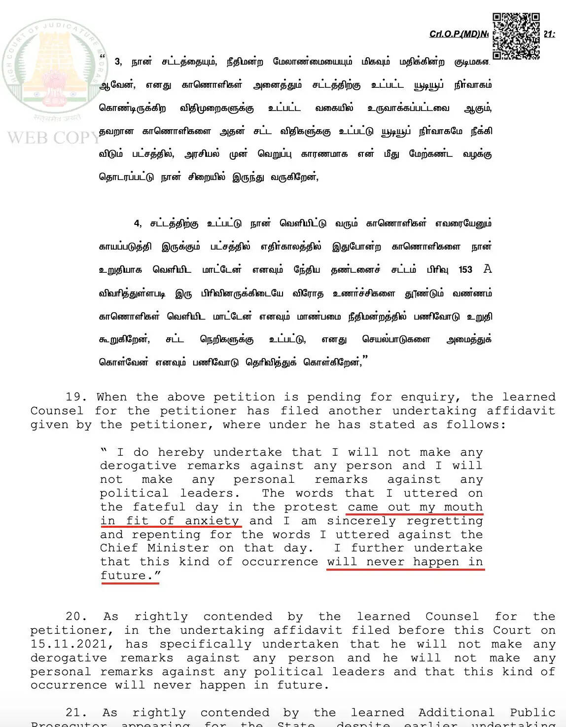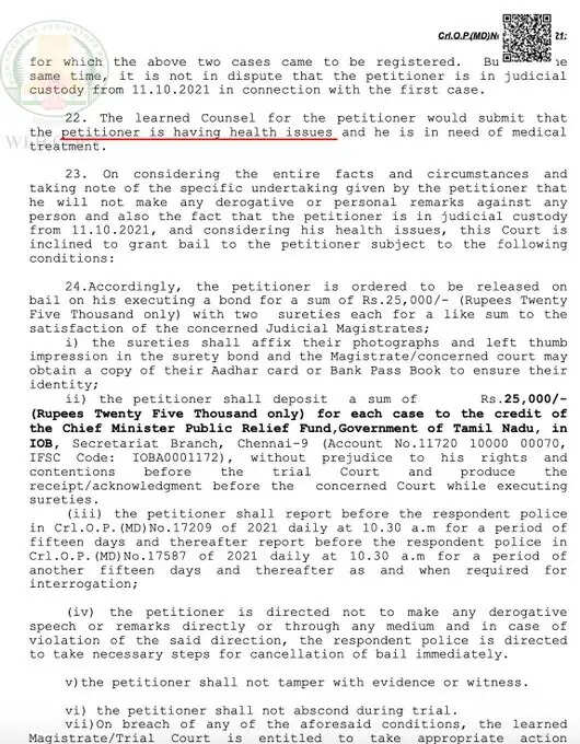 இந்நிலையில் உணர்ச்சி வேகத்தில் தான் அப்படி பேசியதாகவும், இனி தான் அதுபோல் பேச மாட்டேன் என்று அவர் ஜாமீன் மனுவில் குறிப்பிட்டிருக்கிறார். ஜாமீன் மனுவில் அவர் குறிப்பிட்டிருந்த தகவல்கள் தற்போது இணையத்தில் வைரலாகி வருகிறது. மேலும் அதில் தனக்கு உடல்நிலை சரியில்லை என்றும் குறிப்பிட்டிருக்கிறார். இதனைக் குறிப்பிட்டு நெட்டிசன்கள் அவரை விமர்சித்து வருகின்றனர்.