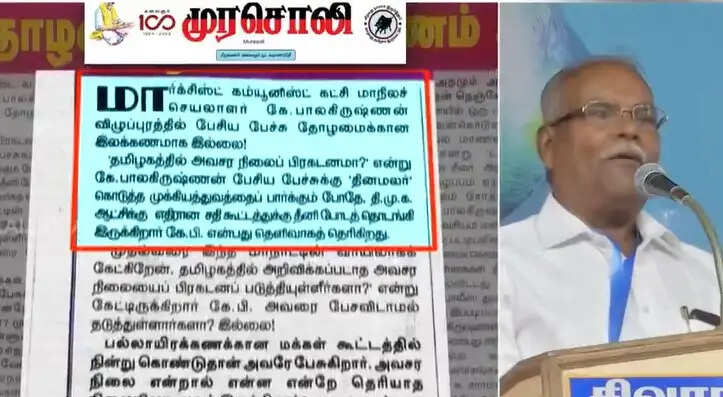 விழுப்புரத்தில் நடைபெற்ற கட்சி பொதுக் கூட்டத்தில் பேசிய மாநில செயலாளர் கே.பாலகிருஷ்ணன், “தமிழகத்தில் போராட்டம் ஆர்பாட்டத்திற்கு நடத்த அனுமதி மறுப்பது ஏன்? தமிழ்நாட்டில் அறிவிக்கப்படாத அவசர பிரகடனம் செய்துவீட்டீர்களா? சீப்பை மறைத்து வைத்துவிட்டதால் திருமணத்தை நிறுத்திவிடலாம் என்று நினைக்க வேண்டாம். விவசாயிகளுக்கு, தொழிலாளர்களுக்கு எதிராக திமுக அரசு செயல்பட்டால் அதற்கு எதிராக போராட்டம் செய்வோம்” எனக் கூறியிருந்தார். இதற்கு கண்டனம் தெரிவித்த திமுக நாளேடான முரசொலி, “தி.மு.க. ஆட்சிக்கு எதிரான சதி கூட்டத்துக்கு தீனி போடத் தொடங்கி இருக்கிறார் கே.பாலகிருஷ்ணன்.... மார்க்சிஸ்ட் மாநில செயலாளர் கே.பாலகிருஷ்ணனின் பேச்சு தோழமைக்கு இலக்கணம் அல்ல. தமிழகத்தில் அவசர நிலைப் பிரகடனமா? என அவர் பேசியதை தடுக்கவில்லை. தமிழ்நாட்டில் போராட்டமோ, ஆர்ப்பாட்டமோ நடத்தப்படவில்லையா? நடக்கவே இல்லையா? போராட்டங்களை நடத்திவிட்டு போராட்டம் நடத்த அனுமதிப்பது இல்லை என்று சொல்வது கூட்டணி அறமும் அல்ல, அரசியல் அறமும் அல்ல, மனசாட்சிக்கும் அறமல்ல” என சாடியிருந்தது.