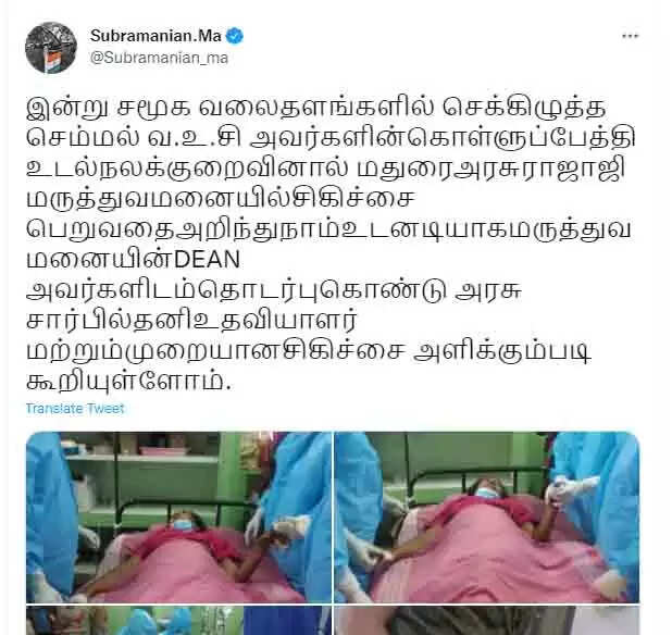 மதுரை ராஜாஜி அரசு மருத்துவமனையில் சிகிச்சை பெற்று வரும் வ. உ. சிதம்பரனாரின் கொள்ளு பேத்திக்கு உதவி செய்ததாக சுகாதாரத்துறை அமைச்சர் மா. சுப்பிரமணியன் செய்தி வெளியிட்டிருந்த நிலையில் அவர் வ.உ.சியின் பேத்தியை இல்லை என்று வஉசி குடும்பத்தினர் பரபரப்பு வீடியோவினை வெளியிட்டு இருக்கிறார்கள்.