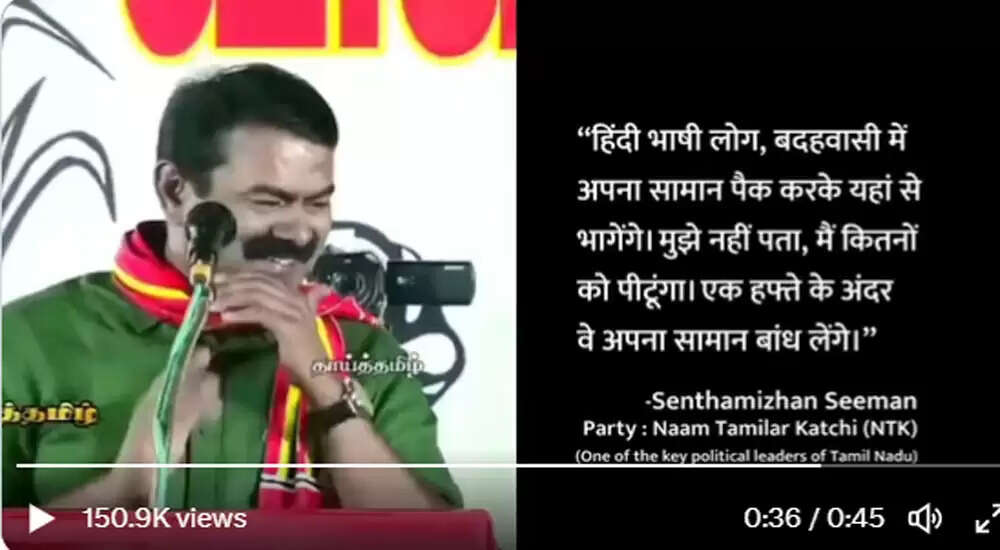 அந்த வீடியோவில், ‘’நான் அதிகாரத்திற்கு வந்தால் தெறிச்சு ஓடுவான். இந்திக்கார பசங்க எல்லாம் அவனே பெட்டிய கட்டிக்கிட்டு ஓடுவான். எத்தனை பேரை வச்சு வெளுப்பேன் என்று தெரியாது. கஞ்சா வச்சிருந்தான் உள்ளே போடு, அபின் வச்சிருந்தான் உள்ளே போடு, பெண்ணை கையை பிடிச்சு இழுத்தான் உள்ளே போடு என்று ஆயிரம் பேரை தூக்கி உள்ள போட்டு , சோறு போடாம அடிச்சு பிச்சி விட்டா. கையெடுத்து கும்பிட்டு அத்தனைபேரும் ஓடிடுவான். ஒரே வாரத்துல ஓடிடுவான். ’’ என்று பேசி இருக்கிறார் சீமான்.
