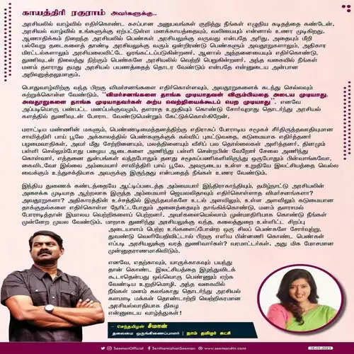 கசப்பான அனுபவங்கள்... காயத்ரிக்கு சீமான் எழுதிய பதில் கடிதம்