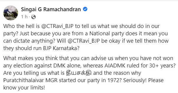 இதற்கு கண்டனம் தெரிவித்துள்ள அதிமுகவின் தகவல் தொழில்நுட்ப கோவை மண்டல செயலாளர் சிங்கை ராமசந்திரன் பாஜகவை தனது முகநூல் பக்கத்தில், “எந்த கட்சி என்றாலும் அந்த கட்சிக்கு தொண்டர்கள் இருக்கிறார்கள், தலைவர்கள் இருக்கிறார். தமிழகத்தில் 30 ஆண்டுகளுக்கு மேல் ஆட்சி செய்த கட்சியின் தலைவர் எடப்பாடி பழனிசாமிக்கு தெரியும் எப்படி எங்களை வழிநடத்த வேண்டுமென்று! அதை பாஜக சொல்ல வேண்டும் என்ற அவசியம் இல்லை. ஆனால் தமிழகத்தை பொறுத்தவரை அதிமுகவே தேசிய தலைமையிலான கூட்டணி. பாஜக தேசிய கட்சி என்பதால் எதை வேண்டுமானாலும் கூறலாமா? தேசியக் கட்சி என்றால் எங்களை என்ன வேண்டுமானாலும் ஆணையிடுவீர்களா? கர்நாடகாவை எப்படி ஆள வேண்டும் என்று நாங்கள் சொன்னால் சி.டி.ரவி ஒப்புக்கொள்வாரா?” எனக் கேள்வி எழுப்பினார்.