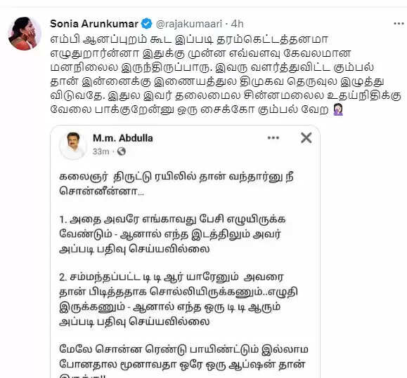 இந்த நாயிகளுக்கு அதுங்க பேசுறதுலாம் வலிக்கிதுன்னு ஒரமா உக்காந்து அழுவாங்கன்னு வேற நெனப்பு. சங்கிகளும் இதுகளும் வேற வேற இல்ல. கஸ்தூரிக்கு எதிரா எம்எம் அப்துல்லா பொங்கிட்டார்ன்னு ஃபயர் விட்டுட்ருக்காய்ங்க. ஒரு காலத்துல கஸ்தூரி மாதிரி திமுக, கலைஞர், ஸ்டாலின மோசமா பேசின கும்பலோட தான் இப்ப முழு நேரமும் அவர் குப்பை கொட்டிட்டு இருக்கதேன்னு இவங்களுக்கு எப்படி புரிய வெக்கிறது?’’என்று விளாசி இருக்கிறார்.