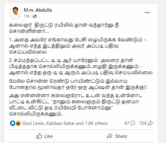 அது என்னன்னா கலைஞரோட உடன் வந்த உன்னோட பாட்டி உன்கிட்ட ‘’நானும் கலைஞரும் திருட்டு தனமா வீட்டை விட்டு ஓடி ரயிலேறி போனோம்னு’’ சொல்லியிருக்கணும்.’’என்று தனது வலைத்தளத்தில் பதிவிட்டிருக்கிறார்.