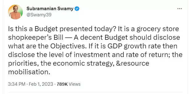 இது மளிகை கடை பில் என்று மத்திய அரசின் 2023 24 ஆம் ஆண்டுக்கான நிதிநிலை அறிக்கை குறித்து பாஜக மூத்த தலைவர் சுப்பிரமணியசாமி கடுமையான விமர்சனத்தை தெரிவித்திருக்கிறார்.
