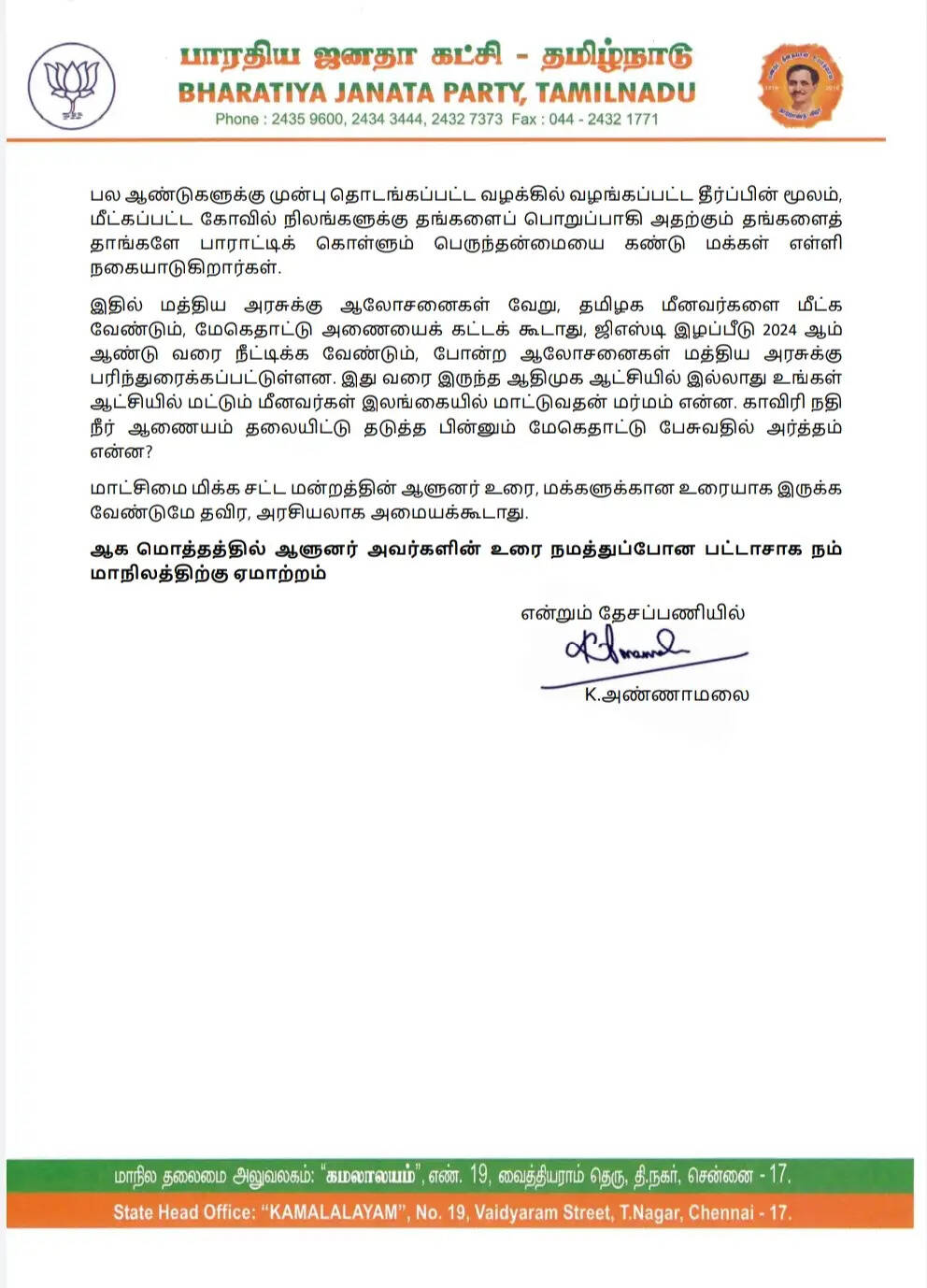 இதில் மத்திய அரசுக்கு ஆலோசனைகள் வேறு, தமிழக மீனவர்களை மீட்க வேண்டும், மேகெதாட்டு அணையைக் கட்டக் கூடாது, ஜிஎஸ்டி இழப்பீடு 2024 ஆம் ஆண்டு வரை நீட்டிக்க வேண்டும், போன்ற ஆலோசனைகள் மத்திய அரசுக்கு பரிந்துரைக்கப்பட்டுள்ளன. இது வரை இருந்த ஆதிமுக ஆட்சியில் இல்லாது உங்கள் ஆட்சியில் மட்டும் மீனவர்கள் இலங்கையில் மாட்டுவதன் மர்மம் என்ன. காவிரி நதி நீர் ஆணையம் தலையிட்டு தடுத்த பின்னும் மேகதாது குறித்து பேசுவதில் அர்த்தம் என்ன?