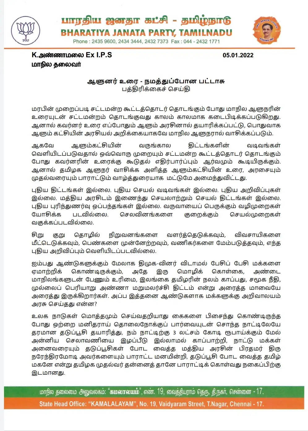 ஆளுநர் உரை - அது முதல்வரை பாராட்டும் உரை.. மொத்தத்தில் நமத்துபோன பட்டாசு...- பாஜக மாநிலத் தலைவர் அண்ணாமலை...