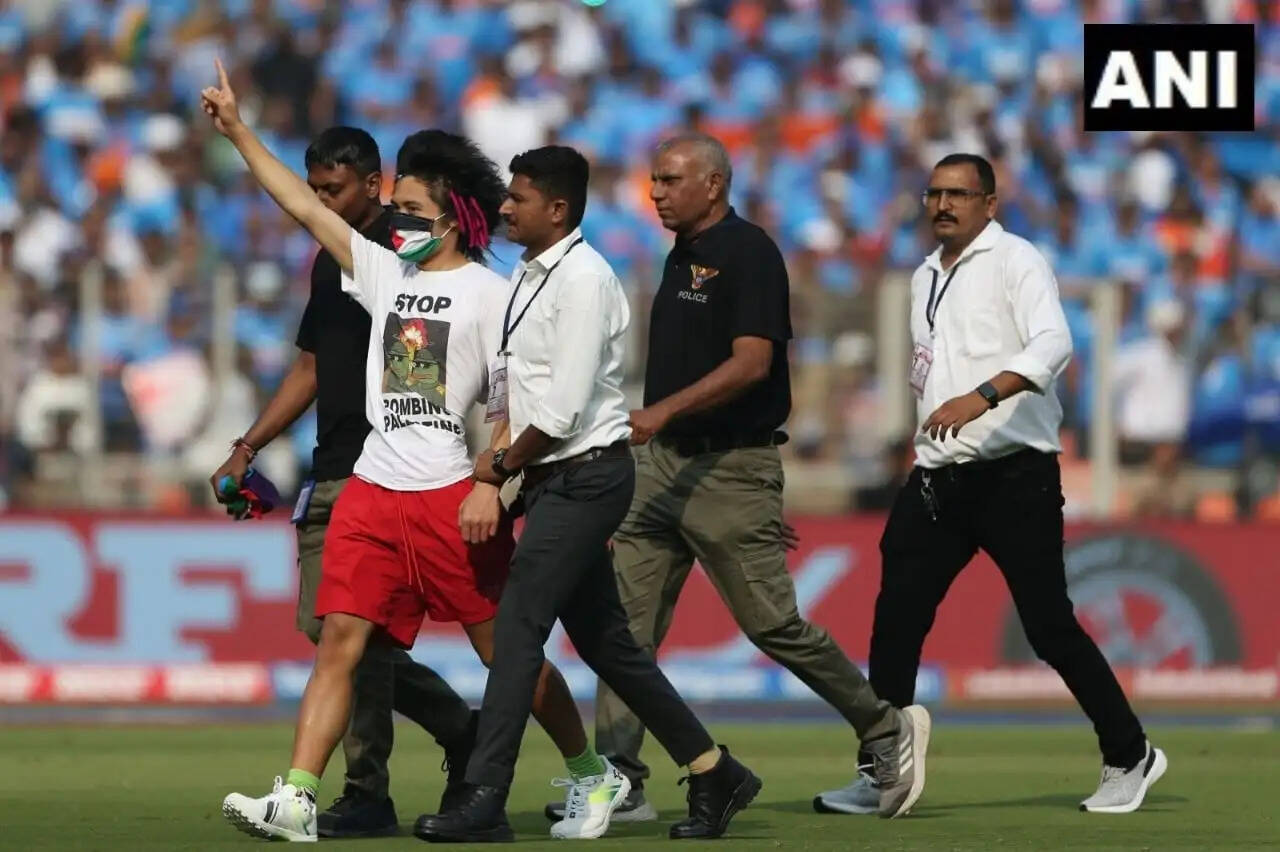 இந்த நிலையில், உலக கோப்பை இறுதிப் போட்டி நடைபெறும் மைதானத்திற்குள் பாலஸ்தீன கொடியுடன் ஒரு நபர் உள்ளே அத்துமீறி நுழைந்ததால் பெரும் பரபரப்பு ஏற்பட்டது. போட்டி நடைபெற்றுக் கொண்டிருக்கும் போது திடீரென ஒரு இளைஞர் கையில் பாலஸ்தீன கொடியுடன் மைதானத்திற்குள் அத்துமீறி நுழந்தார். அந்த நபர் வீராட்கோலியின் அருகே சென்று அவரது தோளில் கையை போட்டார். உடனடியாக மைதானத்திற்குள் நுழைந்த பாதுகாப்பு வீரர்கள் அந்த நபரை அங்கிருந்து அப்புறப்படுத்தினர். இதனால் மைதானத்தில் சிறிது நேரம் பரபரப்பு ஏற்பட்டது.