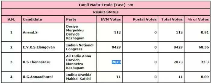 ஈரோடு கிழக்கு தொகுதி இடைத்தேர்தலில் வாக்கு எண்ணிக்கையின் முதல் சுற்று நிலவரங்களை தேர்தல் ஆணையம் அதிகாரபூர்வமாக அறிவித்துள்ளது.