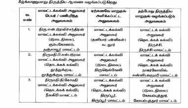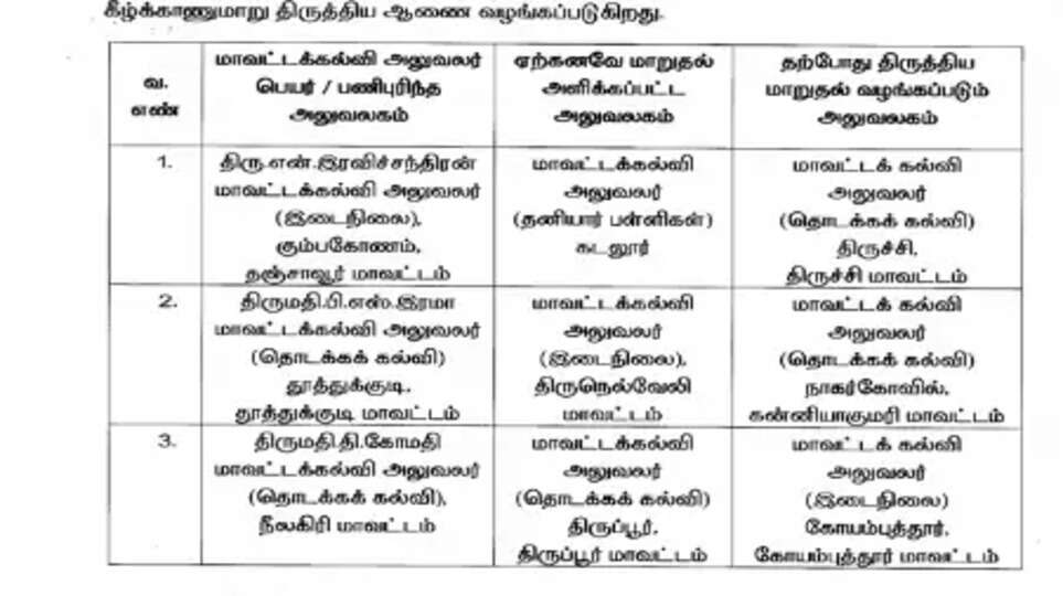 இதுகுறித்து வெளியிடப்பட்டுள்ள அறிக்கையில், “ தஞ்சை மாவட்டம் கும்பகோண்டம் மாவட்ட கல்வி அலுவலராக இருந்த ரவிச்சந்திரனுக்கு ஏற்கனவே கடலூர்மாவட்ட தனியார் பள்ளிகல் மாவட்ட கல்வி அலுவலராக பொறுப்பு வழங்கப்பட்டிருந்தது. தற்போது திருத்தப்பட்ட ஆணையில் திருச்சி மாவட்டம் தொடக்கக்கல்வி மாவட்டல் கல்வி அலுவலராக அவர் பணி மாற்றம் செய்யப்பட்டுள்ளார்.