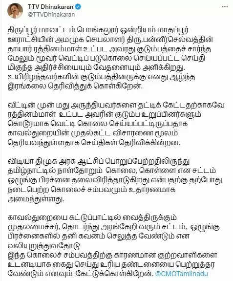அமமுக செயலாளர் குடும்பத்தினர் படுகொலை - தினகரன் கண்டனம்