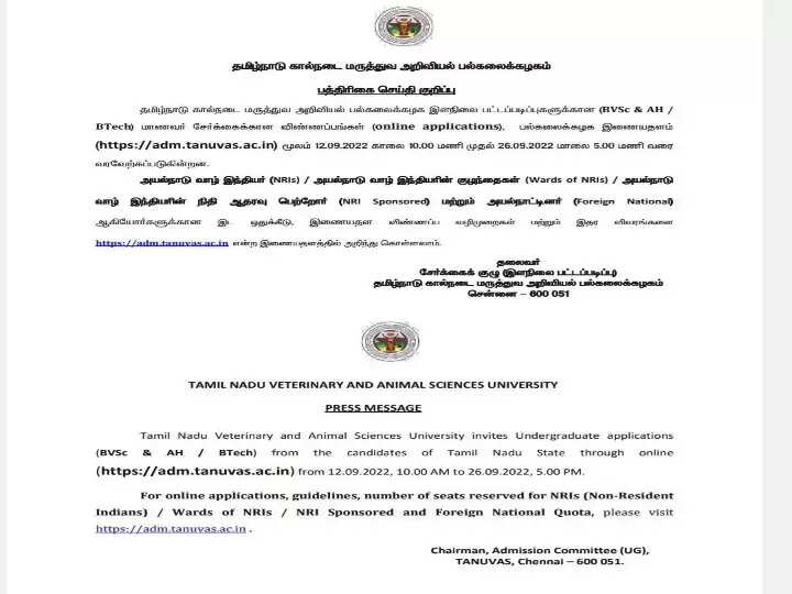 இதுகுறித்து இளநிலை பட்டப்படிப்பு தமிழ்நாடு கால்நடை மருத்துவ அறிவியல் பல்கலைக்கழகம் தலைவர் சேர்க்கைக் குழு வெளியிட்டுள்ள செய்திக்குறிப்பில், "தமிழ்நாடு கால்நடை மருத்துவ அறிவியல் பல்கலைக்கழக இளநிலை பட்டப்படிப்புகளுக்கான (BVSc & AH / BTech) மாகானவர் சேர்க்கைக்கான விண்ண ப்பங்கள் (online applications), பல்கலைக்கழக இணையதளம் (https://adm.tanuvas.ac.in) மூலம் 1209.2022 காலை 10.00 மணி முதல் 25.09.2022 மாலை 5.00 மணி வரை வரவேற்கப்படுகின்றன.