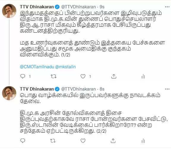 இந்நிலையில் அம்மா மக்கள் முன்னேற்ற கழகத்தின் பொதுச்செயலாளர் டிடிவி தினகரன் தனது ட்விட்டர் பக்கத்தில், "இந்துமதத்தைப் பின்பற்றுபவர்களை இழிவுபடுத்தும் விதமாக தி.மு.க.வின் துணைப் பொதுச்செயலாளர் திரு.ஆ.ராசா மிகவும் கீழ்த்தரமாக பேசியிருப்பது கண்டனத்திற்குரியது. மத உணர்வுகளைத் தூண்டும் இத்தகைய பேச்சுகளை அனுமதிப்பது சமூக அமைதிக்கு குந்தகம் விளைவிக்கும். பொது வாழ்க்கையில் இருப்பவர்களுக்கு நாவடக்கம் தேவை. தி.மு.க அரசின் தோல்விகளைத் திசை திருப்புவதற்காகவே ராசா போன்றவர்களை பேசவிட்டு, திரு.ஸ்டாலின் வேடிக்கைப் பார்க்கிறாரோ? என்ற சந்தேகம் ஏற்பட்டிருக்கிறது" என்று குறிப்பிட்டுள்ளார்.