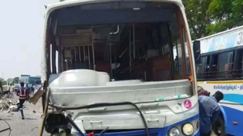 கார் டயர் வெடித்து அரசு பேருந்து மீது மோதியது- இருவர் பலி