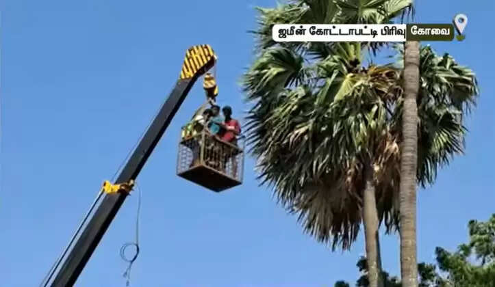 பின்னர் இரும்புக்குண்டு பொருத்தப்பட்ட ராட்சச கிரேன் கொண்டுவரபட்டு மேலே சென்ற தீயணைப்பு வீரர்கள் மது போதையில் பனை மரத்தின் கிளைகளில் உறங்கிக் கொண்டிருந்த அந்த நபரை லாவகமாக தூக்கி இரும்பு குண்டில் வைத்து கீழே கொண்டு வந்தனர். மூன்று மணி நேரத்துக்கு மேல் போராடி தீயணைப்பு வீரர்கள் அந்த ஆசாமியை கீழே இறக்கியவுடன் அங்கிருந்த நூற்றுக்கணக்கான மக்கள் ஆரவாரத்துடன் கைகளை தட்டி நன்றி தெரிவித்தனர் . அந்த நபரிடம் விசாரணை மேற்கொண்டபோது பொள்ளாச்சி அருகே உள்ள ஆனைமலை செம்மனாம்தியைச் சேர்ந்த கூலித் தொழிலாளி லட்சுமணன் என்பதும் மது அருந்திவிட்டு மரம் ஏறுவதை வழக்கமாகக் கொண்டுள்ளார்.