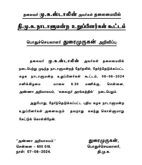 இதுதொடர்பாக பொதுச்செயலாளர் துரைமுருகன் வெளியிட்டுள்ள அறிக்கையில், தலைவர் மு.க.ஸ்டாலின் அவர்கள் தலைமையில் நடைபெற்று முடிந்த நாடாளுமன்றத் தேர்தலில், தேர்ந்தெடுக்கப்பட்ட கழக நாடாளுமன்ற உறுப்பினர்கள் கூட்டம், 08-06-2024 சனிக்கிழமை மாலை 6.30 மணிக்கு, சென்னை, அண்ணா அறிவாலயம், 'கலைஞர் அரங்கத்தில்' நடைபெறும்.