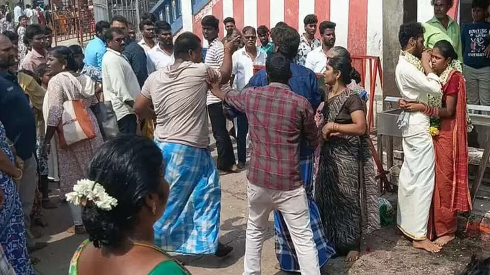 திருவள்ளூர் மாவட்டம் திருத்தணி முருகன் கோயில் மாட வீதியில் வேல் அமைந்துள்ள பகுதியில் காலை பக்தர்கள் தரிசனம் செய்துக் கொண்டிருந்தனர். அங்கு மண கோலத்தில் வந்த இளம் ஜோடி மலர் மாலை மாற்றிக் கொண்டு இளம் பெண் கழுத்தில் தாலி கட்ட முயன்ற போது சினிமா பாணியில் பெண் வீட்டார் மற்றும் வாலிபர் குடும்பத்தினர் அங்கு வந்தனர். மண கோலத்தில் இருந்த பெண்ணை பார்த்த அவரது பெற்றோர் மற்றும் உறவினர்கள் கதறியபடி, எங்களது மகளை கடத்தி வந்து கட்டாய திருமணம் செய்ய பார்ப்பதாக கூச்சலிட்டனர். அங்கிருந்து மணக் கோலத்தில் இருந்த பெண்ணை கட்டாயமாக அழைத்துச் செல்ல பார்த்தபோது வாலிபரின் உறவினர்கள் தடுத்து நிறுத்தியதால் பரபரப்பு நிலவியது. ஒருபுறம் இரு வீட்டார் வாக்குவாதத்தில் இருந்த போதே திடீரென்று கேப்பை பார்த்து இளம் பெண் கழுத்தில் வாலிபர் தாலி கட்டியதால் உச்சகட்ட பரபரப்பு ஏற்பட்டது.