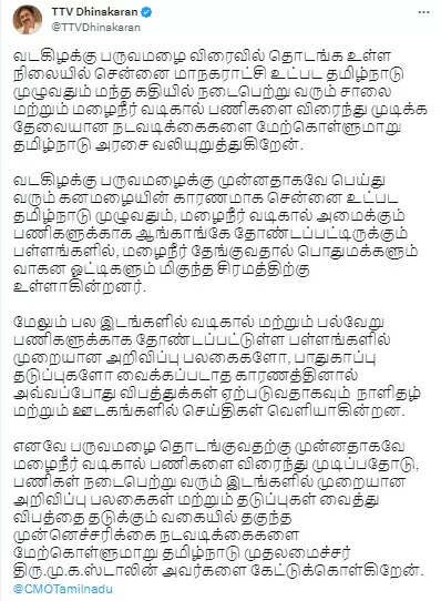 இது தொடர்பாக அம்மா மக்கள் முன்னேற்ற கழகத்தின் பொதுச்செயலாளர் டிடிவி தினகரன் தனது சமூகவலைத்தள பக்கத்தில், வடகிழக்கு பருவமழை விரைவில் தொடங்க உள்ள நிலையில் சென்னை மாநகராட்சி உட்பட தமிழ்நாடு முழுவதும் மந்த கதியில் நடைபெற்று வரும் சாலை மற்றும் மழைநீர் வடிகால் பணிகளை விரைந்து முடிக்க தேவையான நடவடிக்கைகளை மேற்கொள்ளுமாறு தமிழ்நாடு அரசை வலியுறுத்துகிறேன். வடகிழக்கு பருவமழைக்கு முன்னதாகவே பெய்து வரும் கனமழையின் காரணமாக சென்னை உட்பட தமிழ்நாடு முழுவதும், மழைநீர் வடிகால் அமைக்கும் பணிகளுக்காக ஆங்காங்கே தோண்டப்பட்டிருக்கும் பள்ளங்களில், மழைநீர் தேங்குவதால் பொதுமக்களும் வாகன ஓட்டிகளும் மிகுந்த சிரமத்திற்கு உள்ளாகின்றனர்.