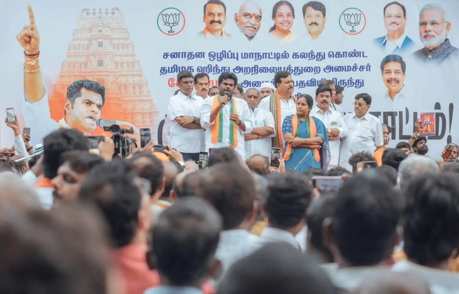 சனாதன ஒழிப்பு கூட்டத்தில் பேசிய திராவிடர் கழகத் தலைவர் வீரமணி அவர்கள், இந்து மதமும் சனாதன தர்மமும் ஒன்று என்று கூறினார். அதன் பிறகு பேசிய அமைச்சர் உதயநிதி ஸ்டாலின், சனாதன தர்மத்தை ஒழிப்போம் என்று பேசுகிறார். இந்து சமய அற நிலையத்துறை அமைச்சராக இருக்கின்ற திரு. சேகர்பாபு, இவற்றை வேடிக்கை பார்த்துக் கொண்டிருக்கிறார். அமைச்சர் உதயநிதியின் பொறுப்பற்ற பேச்சுக்கு, அனைத்து மதத்தைச் சார்ந்த மக்களும் கண்டம் தெரிவித்த பிறகு, மக்களின் கண்டனத்தைக் கண்டு பயந்து, முதலமைச்சர் ஸ்டாலின் சனாதன தர்மம் வேறு இந்து மதம் வேறு என்று மடைமாற்ற முயற்சிக்கிறார். சனாதன தர்மம் எப்பொழுதும் எந்த காலத்திலும் யாருக்கும் எதிரானதாக இருந்ததல்ல. சனாதன தர்மம் இஸ்லாமியர்களுக்கும் கிறிஸ்தவத்துக்கும் எதிரானதாக இருந்திருந்தால், நமது நாட்டில் எப்படி இஸ்லாமும் கிறிஸ்துவமும் வளர்ந்திருக்க முடியும்? உண்மையான பிரச்சினைகளை திசைதிருப்ப, திமுக மத வெறுப்பைத் தூண்ட முயற்சிக்கிறது.