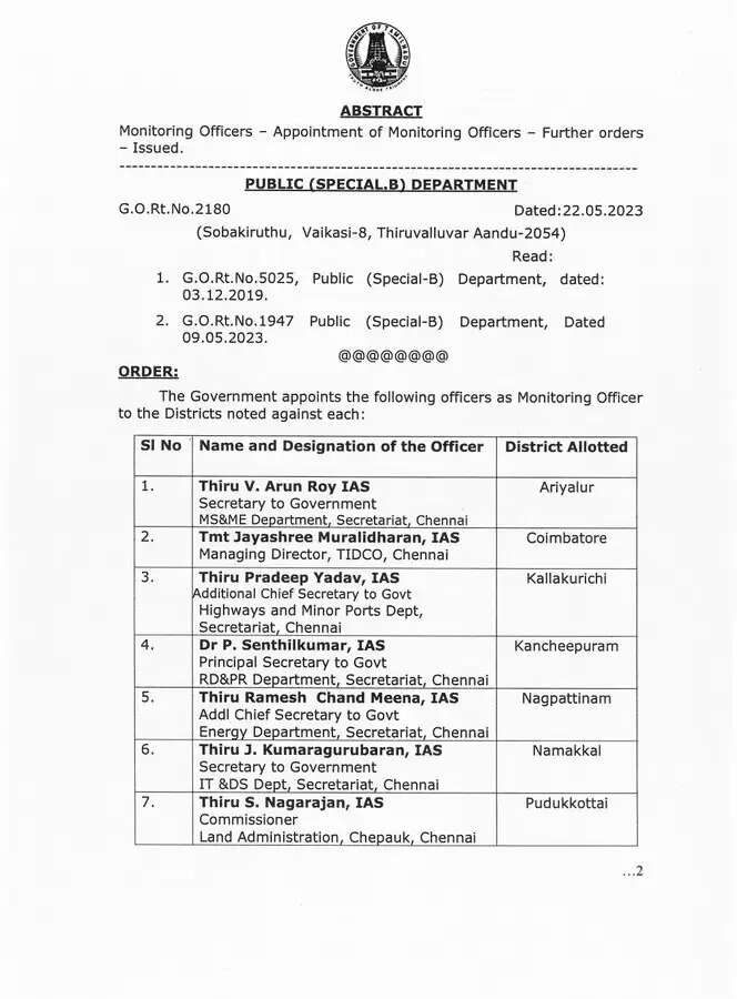 தமிழ்நாட்டின் அரசு வளர்ச்சி திட்டப் பணிகளை கண்காணிக்க 12 மாவட்டங்களுக்கு ஐ.ஏ.எஸ் அதிகாரிகள் நியமனம் செய்யப்பட்டுஅரசாணை வெளியிடப்பட்டுள்ளது.
