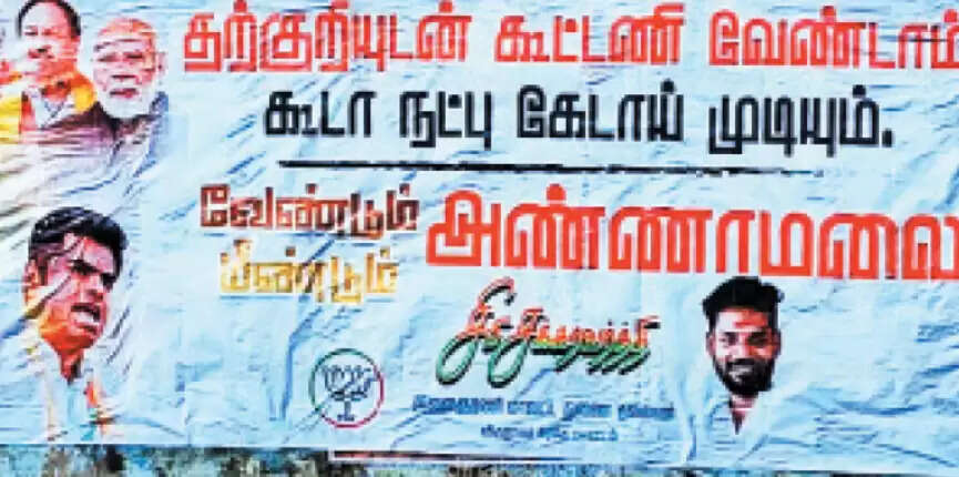 தற்குறியுடன் கூட்டணி வேண்டாம்", "கூடா நட்பு கேடாய் முடியும்"-என அ.இ.அ.தி.மு.க.வை விமர்சிக்கும் வகையிலும் "வேண்டும் மீண்டும் அண்ணாமலை" என அண்ணாமலைக்கு ஆதரவு தெரிவித்தும் வாசகங்கள் அடங்கிய சுவரொட்டி விருதுநகரில் ஒட்டப்பட்டுள்ளது.