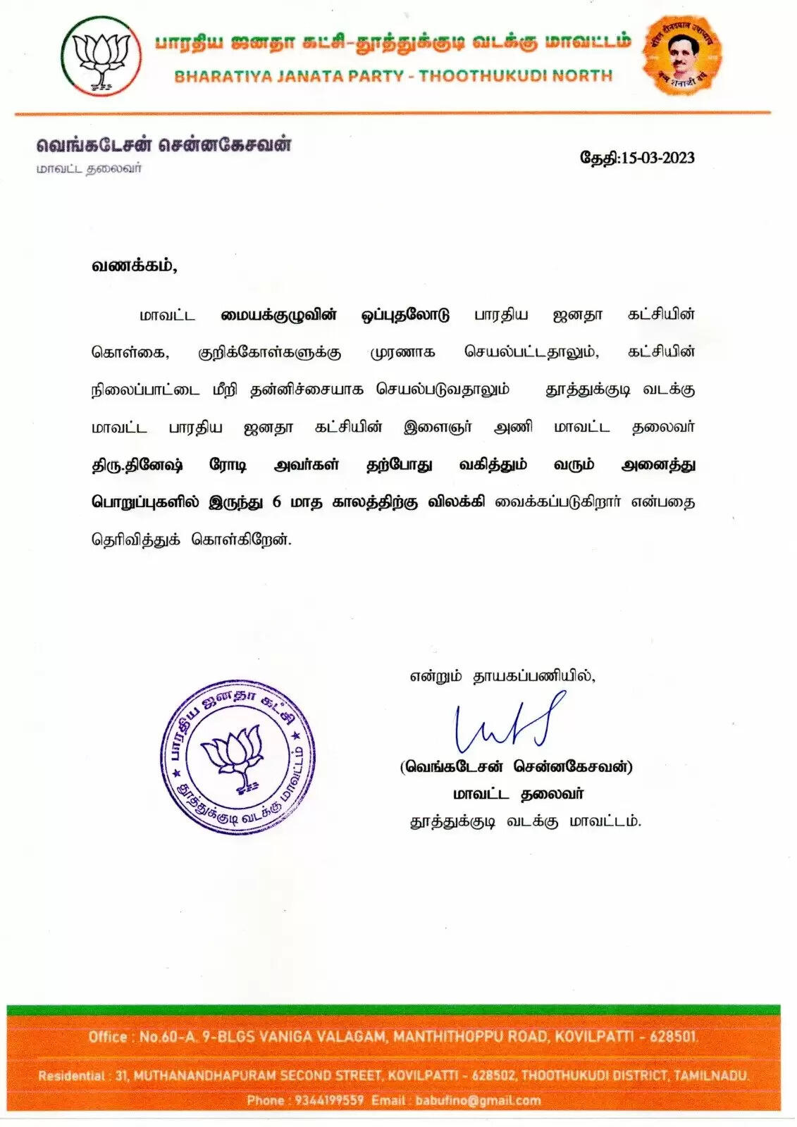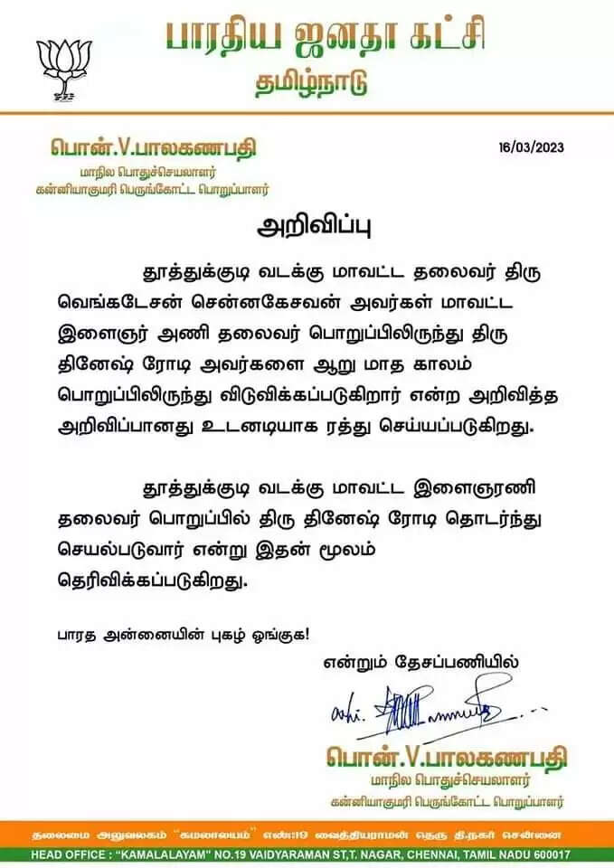 இதுதொடர்பாக அவர் வெளியிட்டுள்ள அறிக்கையில், “தூத்துக்குடி வடக்கு மாவட்ட தலைவர் திரு வெங்கடேசன் சென்னகேசவன் அவர்கள் மாவட்ட இளைஞர் அணி தலைவர் பொறுப்பிலிருந்து திரு தினேஷ் ரோடி அவர்களை ஆறு மாத காலம் பொறுப்பிலிருந்து விடுவிக்கப்படுகிறார் என்ற அறிவித்த அறிவிப்பானது உடனடியாக ரத்து செய்யப்படுகிறது. தூத்துக்குடி வடக்கு மாவட்ட இளைஞரணி தலைவர் பொறுப்பில் திரு தினேஷ் ரோடி தொடர்ந்து செயல்படுவார் என்று இதன் மூலம் தெரிவிக்கப்படுகிறது.” என்று குறிப்பிட்டுள்ளார்.