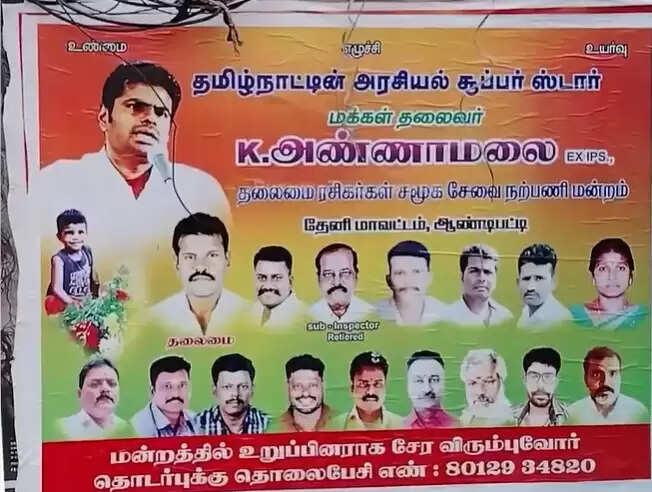 தமிழக பா.ஜ.க., முன்னாள் தலைவர் அண்ணாமலை பெயரில் ரசிகர்கள் சமூக சேவை நற்பணி மன்றம் என்ற பெயரில் தேனி மாவட்டம் ஆண்டிப்பட்டி நகரின் பல்வேறு இடங்களில் பாஜக தொண்டர்கள் போஸ்டர்கள் ஒட்டி உள்ளனர். அந்த போஸ்டரில் மன்றத்தில் உறுப்பினராக சேர்வதற்கு அழைப்பும் விடுத்து அதற்கான மொபைல் நம்பரும் கொடுத்துள்ளனர். மேலும் அந்த போஸ்டரில் ‘தமிழ்நாட்டின் அரசியல் சூப்பர் ஸ்டார்- மக்கள் தலைவர் அண்ணாமலை தலைமை ரசிகர் சமூக சேவை நற்பணி மன்றம் ஆண்டிபட்டி, தேனி மாவட்டம். ’ என்ற வாசகங்கள் இடம்பெற்றுள்ளது