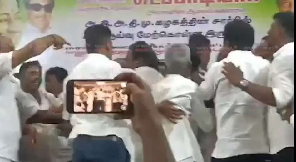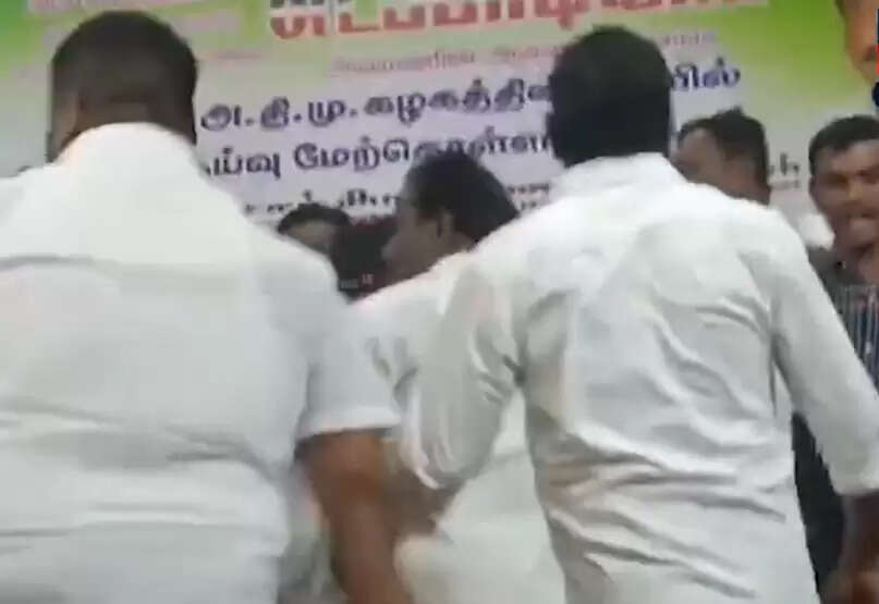 அப்போது மேலூர் கிழக்கு ஒன்றிய செயலாளராக உள்ள பொன் ராஜேந்திரன் என்பவர், இவர் முன்னாள் சேர்மன் (நகர்மன்ற) தலைவராக உள்ள நிலையில் தொடர்ந்து மேலூர் சட்டமன்ற தொகுதியில் வேட்பாளருக்கான இடம் கேட்டு முயற்சி செய்வதாக கூறப்படுகிறது. இவருடைய ஆதரவாளர்கள் மேடை ஏறும் போது மதுரை மாவட்ட எம்ஜிஆர் இளைஞர் அணி செயலாளர் வழக்கறிஞர் ரமேஷ், ஒன்றிய செயலாளர் நிலையூர் முருகன் பெயரை சொல்லவில்லை என வாக்குவாதம் செய்தனர். மேலும் புகைப்படம் சால்வை அணிவிக்க அவர்களுக்குள்ளேயே வாக்குவாதம் ஏற்பட்டு தள்ளுமுள்ளு ஏற்பட்டது, இறுதியாக அது கைகலப்பாக மாறியது. குறிப்பாக மேலே ஏறி வந்த ஒவ்வொருவருடைய பெயரையும் வழக்கறிஞர் ரமேஷ் கூறிய நிலையில் தங்களுடைய பெயரை கூறவில்லை என்றும் அவர்கள் தரப்பில் வாக்குவாதத்தில் ஈடுபட்டனர்.