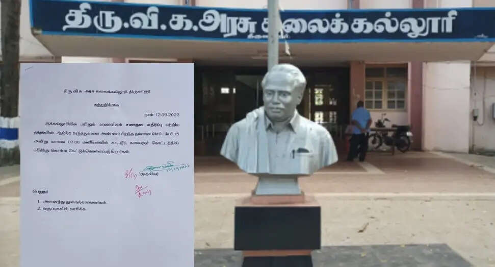 இதுதொடர்பாக திருவாரூர் திருவிக அரசு கலை கல்லூரி முதல்வர் ராஜாராமன் மாணவர்களுக்கு அனுப்பியுள்ள சுற்றறிக்கையில், “திருவிக அரசு கல்லூரியில் பயிலும் மாணவிகள் சனாதன எதிர்ப்பு பற்றிய தங்களின் ஆழ்ந்த கருத்துக்களை அண்ணா பிறந்த நாளான செப்டம்பர் 15ம் தேதி மாலை 3 மணி அளவில் காட்டூரில் உள்ள கலைஞர் கோட்டத்தில் மாணவர்கள் பேச வேண்டும்” எனக் குறிப்பிடப்பட்டுள்ளது.