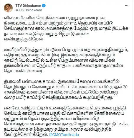 இதுதொடர்பாக அம்மா மக்கள் முன்னேற்ற கழகத்தின் பொதுச்செயலாளர் டிடிவி தினகரன் தனது சமூகவலைத்தள பக்கத்தில், "விவசாயிகளின் கோரிக்கையை ஏற்று நாளையுடன் நிறைவடையும் சம்பா மற்றும் தாளடி நெற்பயிர் காப்பீடு செய்வதற்கான கால அவகாசத்தை மேலும் ஒரு மாதம் நீட்டிக்க நடவடிக்கை எடுக்குமாறு தமிழ்நாடு அரசை வலியுறுத்துகிறேன்.