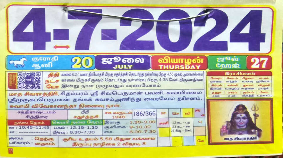 இன்றைய தேதி: 04/07/2024 , வியாழன் (சம நோக்கு நாள்)