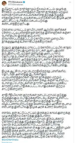தமிழ்நாட்டில் நாள்தோறும் நிலவும் சட்டம்- ஒழுங்கு சீர்கேடு, பட்டியலினத்தவர் மீதான தாக்குதல் மற்றும் வன்கொடுமைச் சம்பவங்களைத் தடுத்து நிறுத்த எந்தவிதமான நடவடிக்கையும் எடுக்காமல் திமுக அரசு அலட்சியப் போக்கில் செயல்படுவது கண்டனத்திற்குரியது என்று தினகரன் தெரிவித்துள்ளார்.